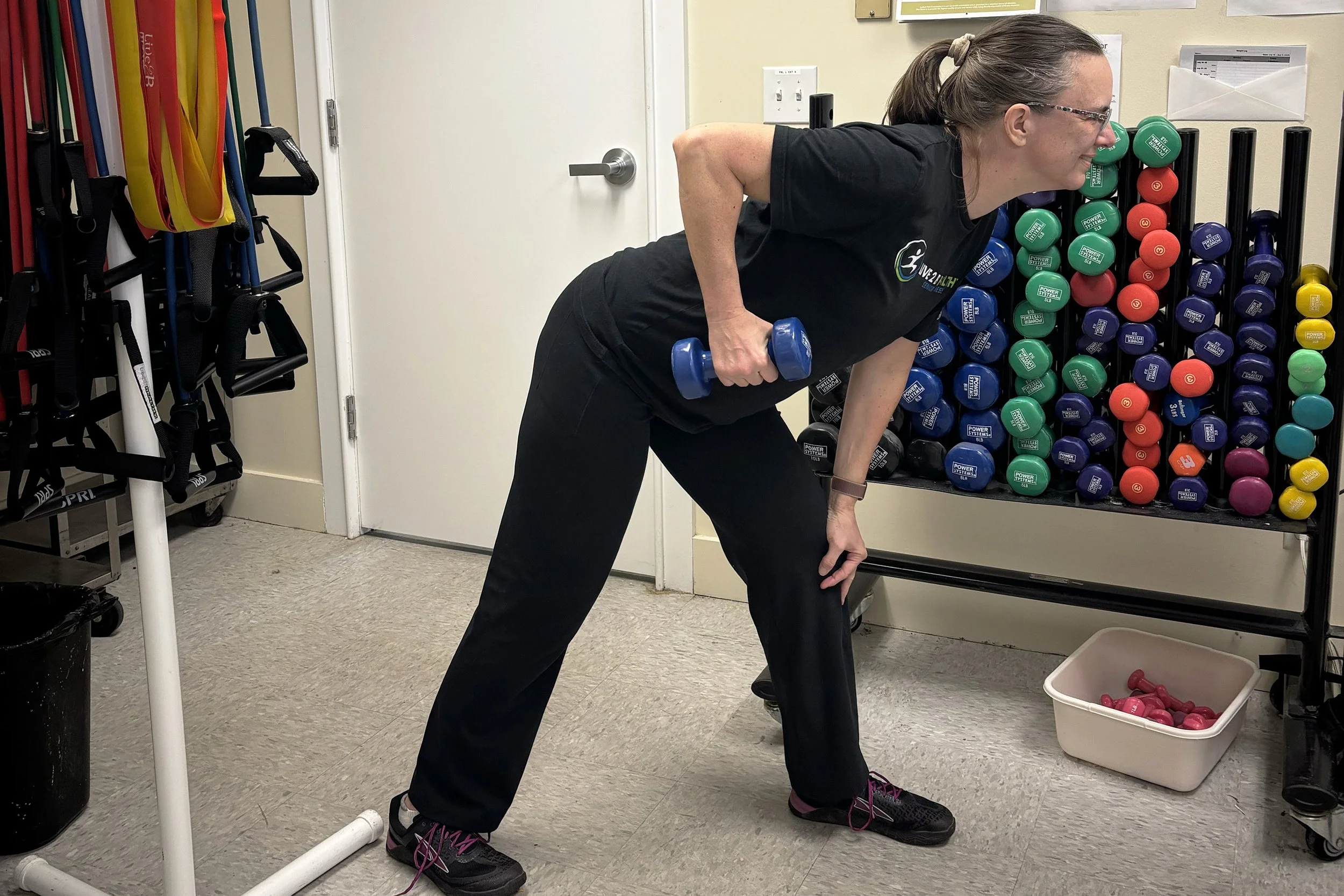 Standing: Stand in a staggered stance. Hinge forward and rest your support hand above your knee or on a chair. Keep your back long and neutral. Let the dumbbell (in your lifting hand) dangle. Pull your elbow up behind you and slowly lower to the starting position.