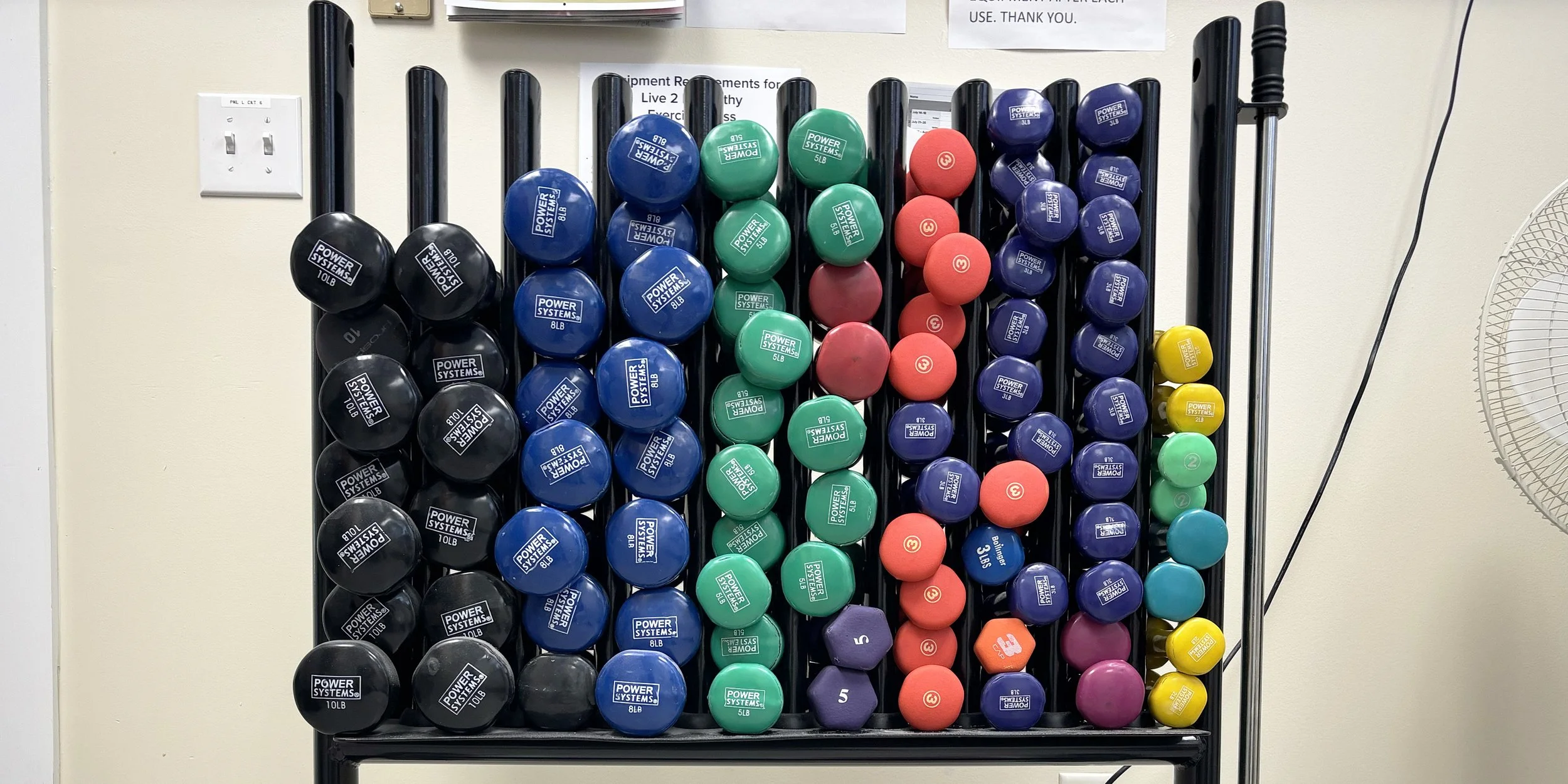 To solve this, I ask you to use “light,” “medium,” and “heavy” weights. (Use the chart on the wall to know which weights we will use on which days.) This article will help you determine which dumbbells equal light, medium, and heavy for you.