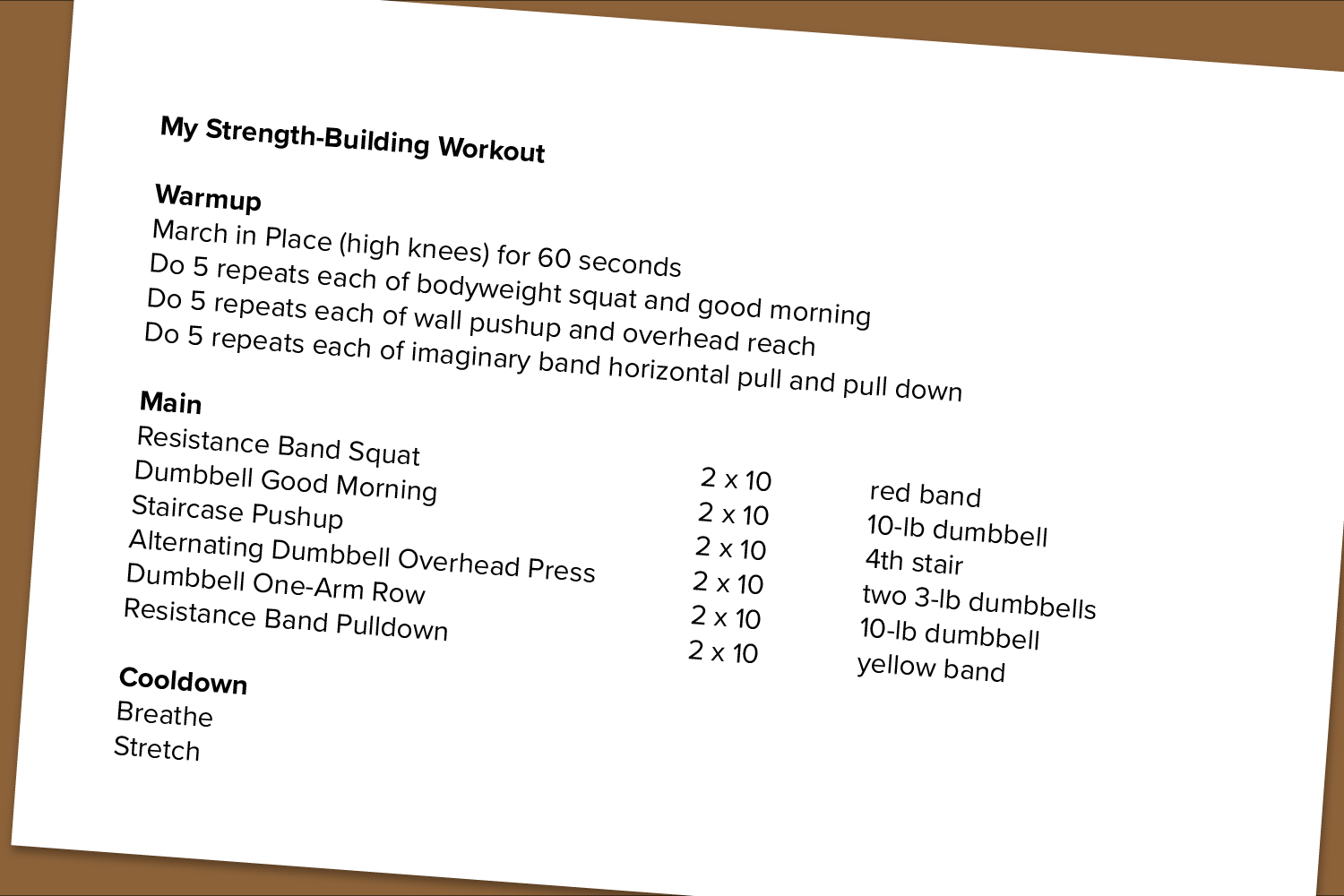 Before you lift, prepare yourself with a warmup. A simple, effective idea is to go for a brisk walk or march in place for a few minutes, and then do each of your chosen exercises a few times without weight.