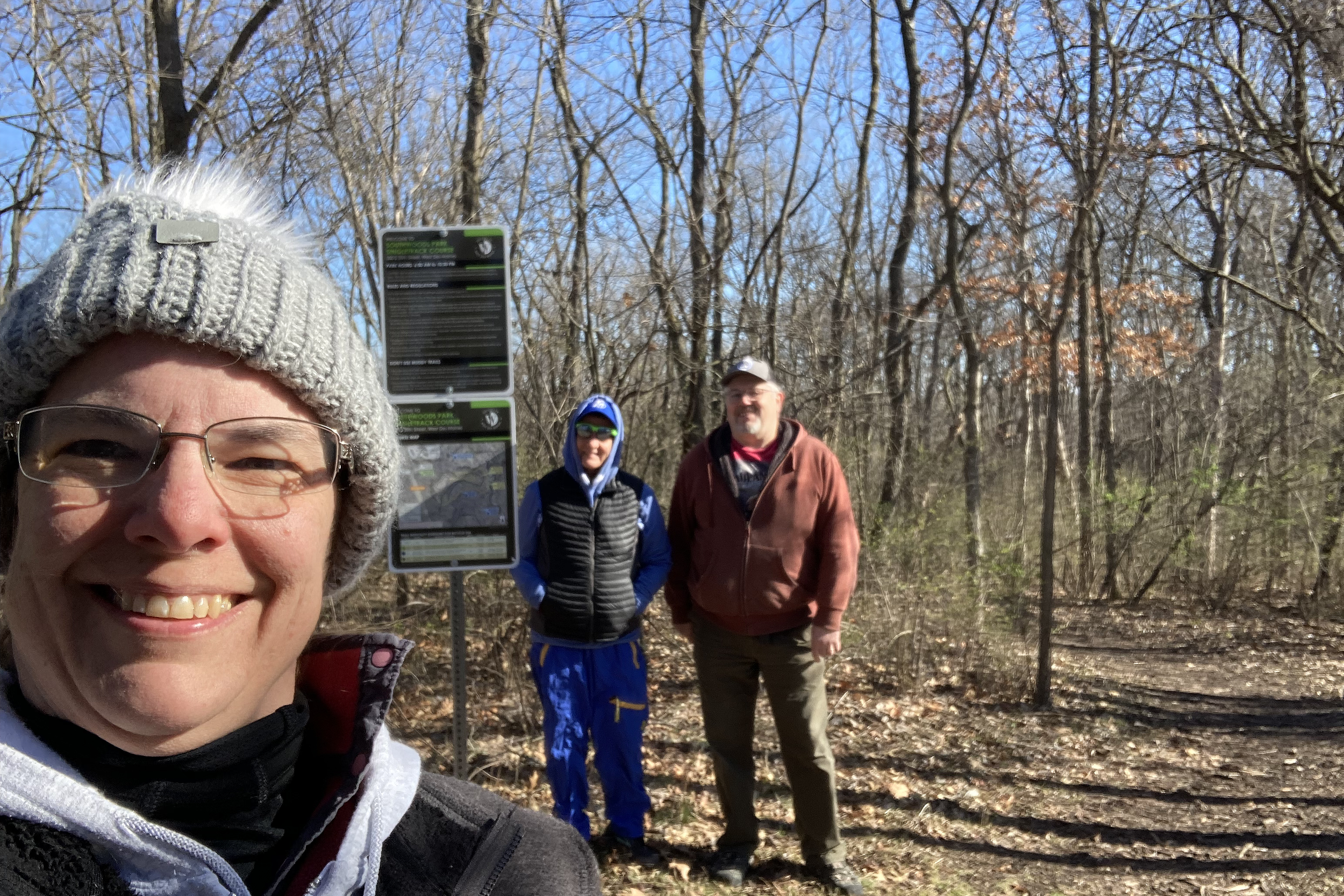 Southwoods Park is hilly. The trails here are relatively clear, compared to other local dirt trails that are punctuated with with roots and rocks. Hiking poles are useful, but not a necessity. If the dirt is muddy, we will walk on the paved trails instead.