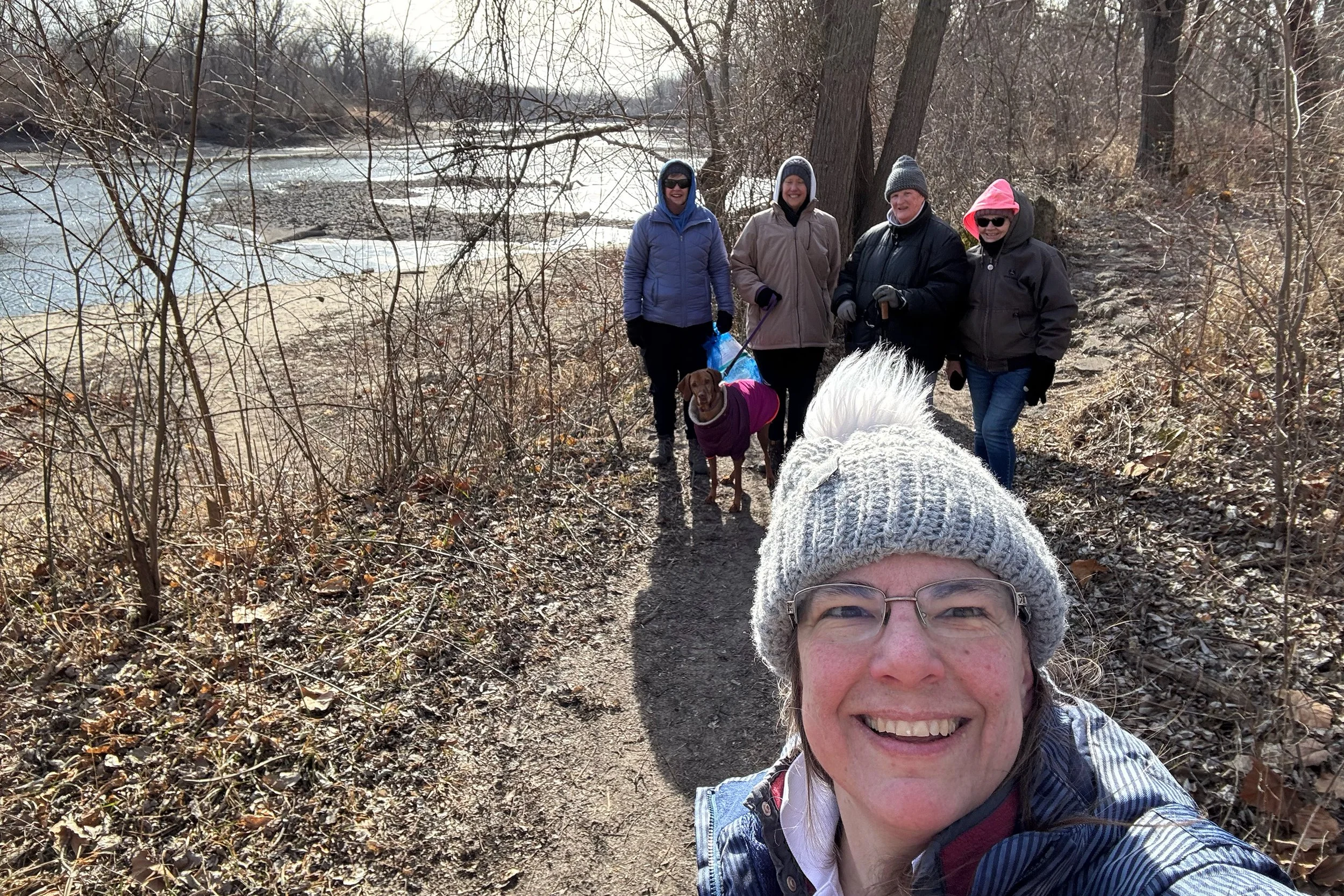 The plan is to head south on the high line, do the loop, cut across on the levee, and return north along the river for a 2.3-mile round trip. If the dirt trails are muddy, we will walk the paved trail instead. Regardless, we will walk slowly, think “stroll,” and no one will be left behind.
