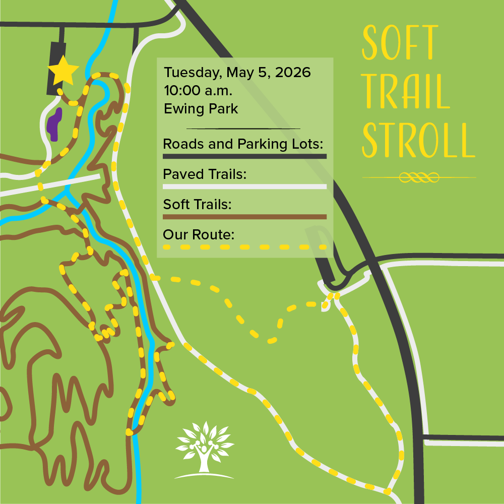 If the dirt trails are muddy, we will use the bridge right by our parking lot to cross the creek. Then we will use the paved paths and possibly grass to explore the lilacs. Either way, we will walk slowly, think “stroll,” and no one will be left behind.